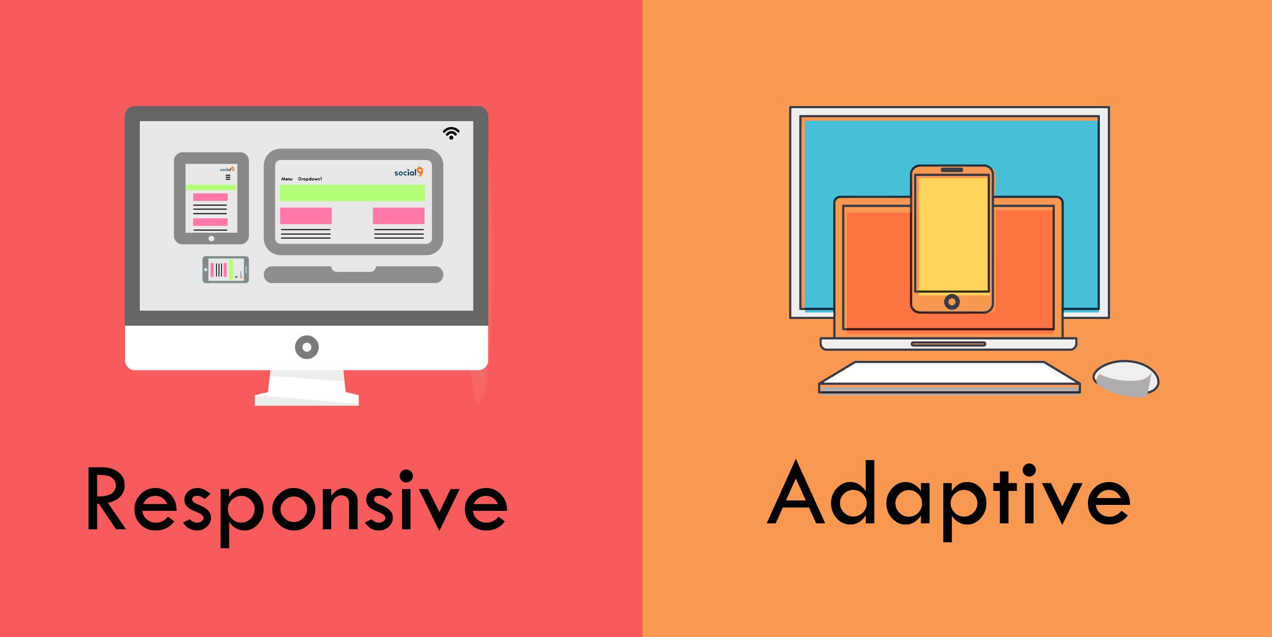 Responsive ve Adaptive arasındaki en büyük fark responsive tasarımların esnek olmasıdır. Responsive akışkan bir yapıya sahipken Adaptive kesin çizgiler içerisindedir. Responsive tasarımlarda %’lik değerler kullanılırken Adaptive tasarımlarda px tarzında ölçülendirme birimleri kullanılır. Bu sebeple responsive tasarımlarda geçişler daha yumuşakken, Adaptive tasarımlarda daha keskindir.
